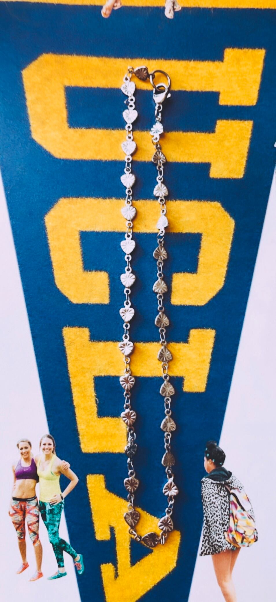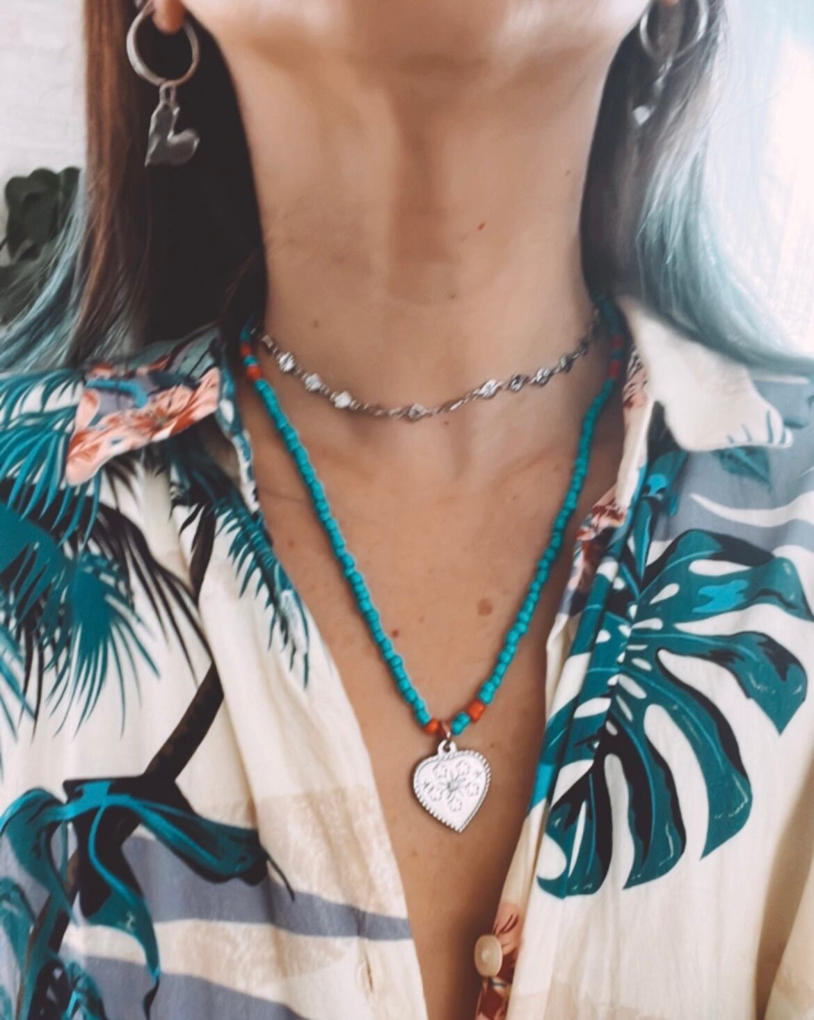 模様の入ったハートが連なってたチョーカーネックレスです。ステンレスを使用しているのでサビずにアレルギーにも安心な素材です。