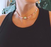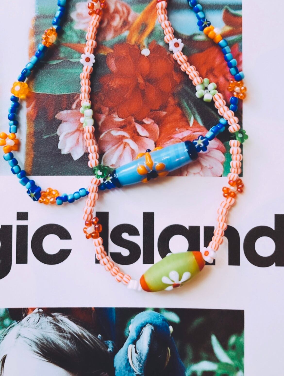 ジャワビーズとビーズでできたフラワー、ミッレリフォーリビーズのフラワーでできたチョーカーネックレスです。A.Bからお選びください。
