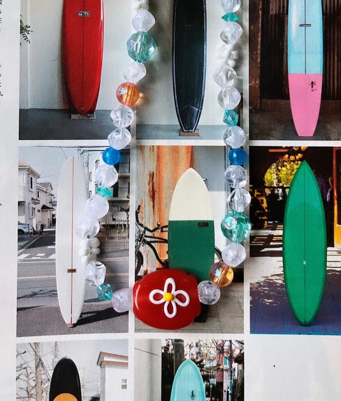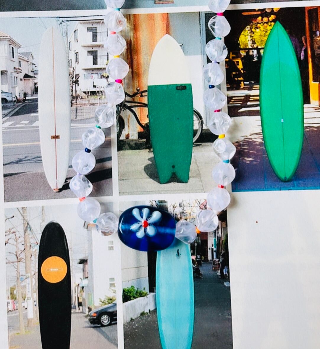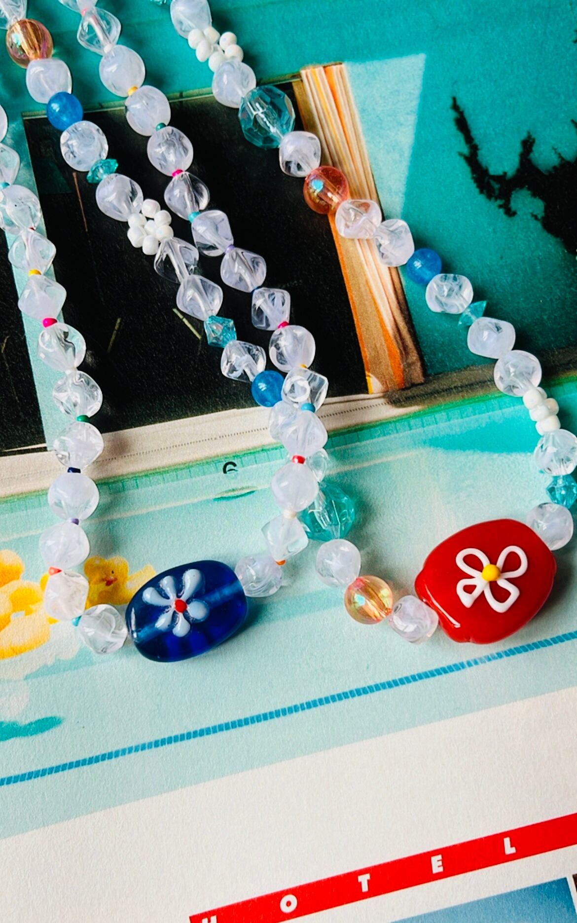 お花の手作りジャワビーズに色々なクリアなパーツでできたネックレスです。赤、青からお選びください。
